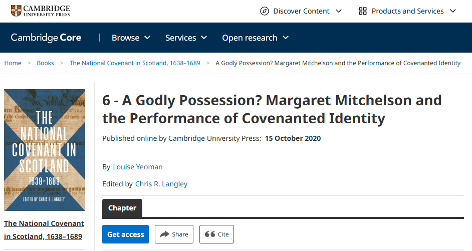 - Yeoman L. A Godly Possession? Margaret Mitchelson and the Performance of Covenanted Identity. In: Langley CR, ed. The National Covenant in Scotland, 1638–1689. Studies in Early Modern Cultural, Political and Social history. Boydell & Brewer; 2020:105-124.
